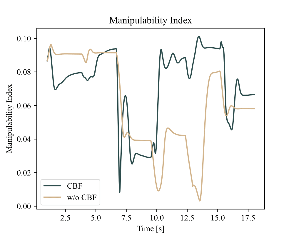 In addition to hard safety constraints, we explored a soft CBF formulation for manipulability maximization. Using an IKFlow-based sampler, we identified high-manipulability joint configurations for a given end-effector pose and introduced a slackened barrier that gently biased the controller toward these configurations.