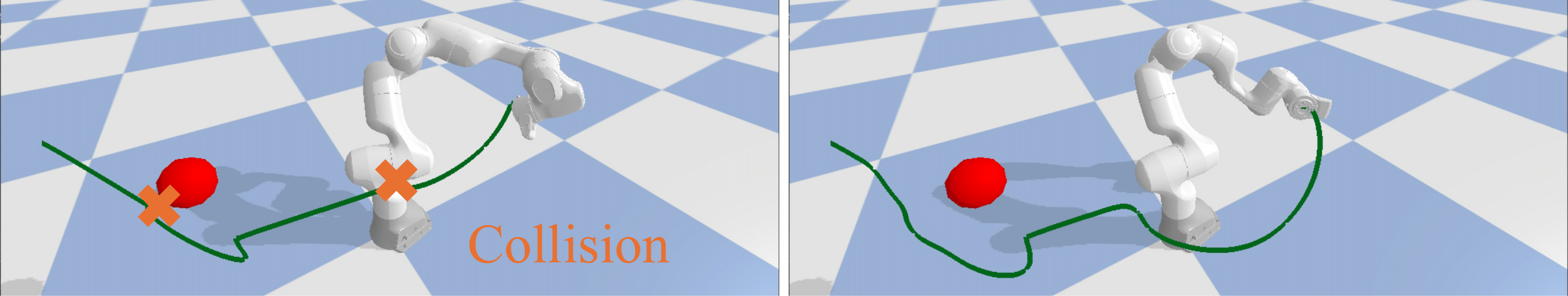To evaluate the controller, we designed a sequence of Cartesian targets that deliberately induced unsafe behavior under the nominal controller. One trajectory passed directly through an external obstacle, while another caused the end effector to collide with the robot’s own links.